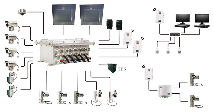 该系统用于对钻井设备各功能区域的实时监控,司钻可通过座椅上的防爆控制键盘任意切换,绞车滚筒、振动筛、泥浆回流口、泥浆罐区、钻井泵区、排管架区、动力猫道、二层台、高位吊卡翻转、铁钻工、钻台面、底座井口、二层台机械手等区域画面显示,云台摄像机的XY旋转、光学变焦、变倍、显示屏分屏切换和系统菜单设置。